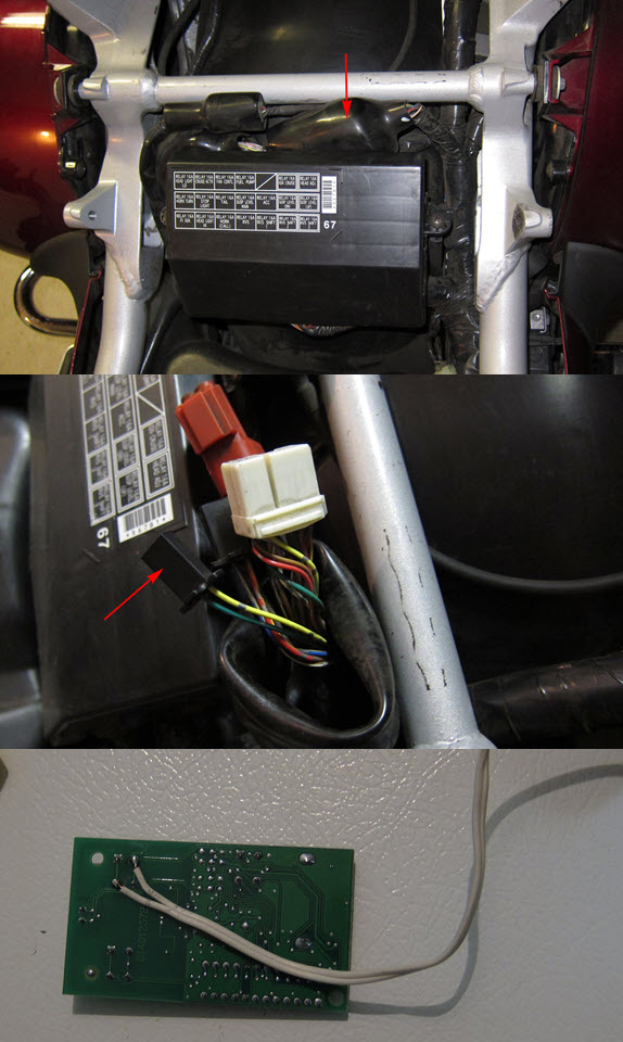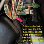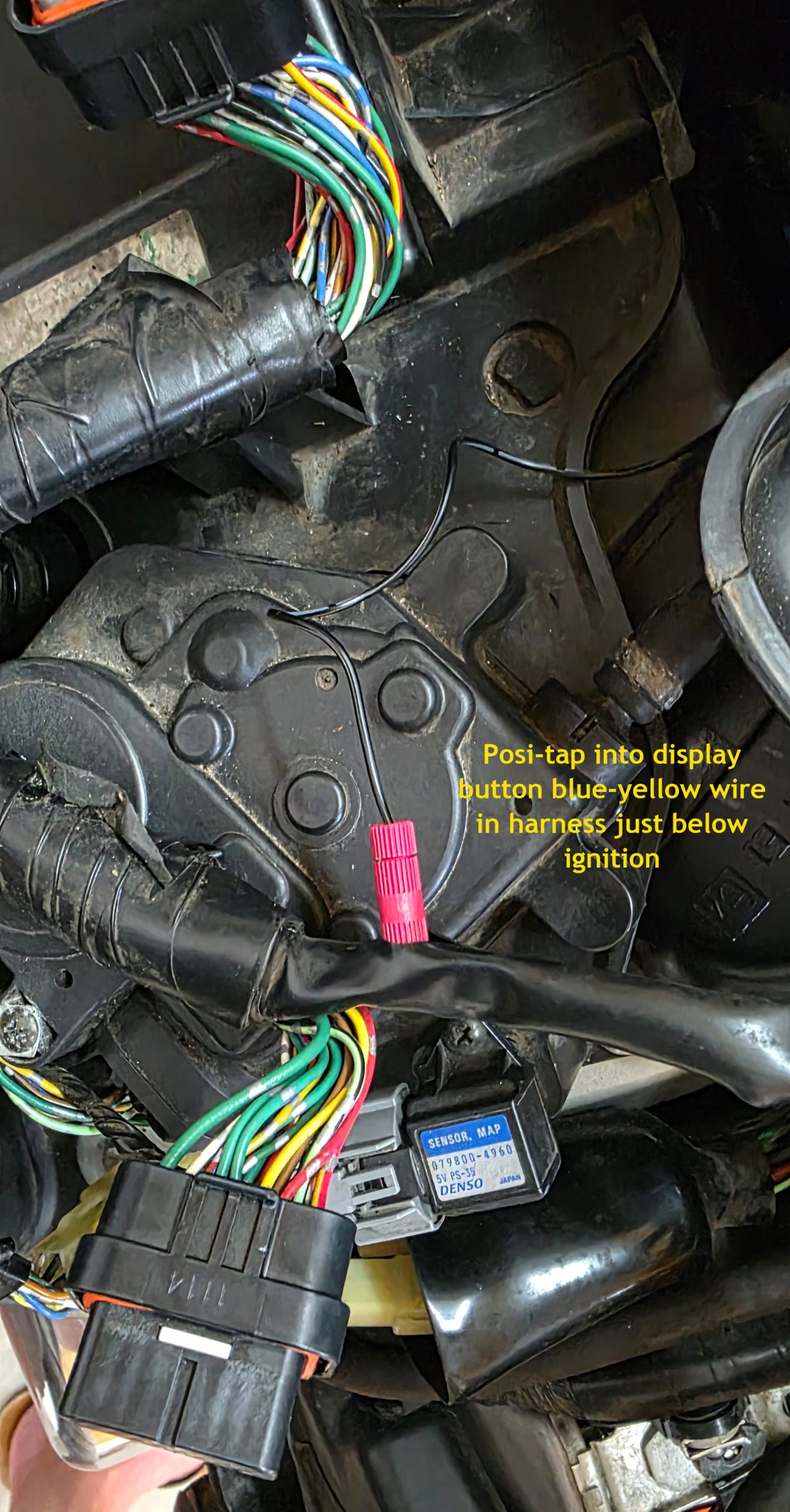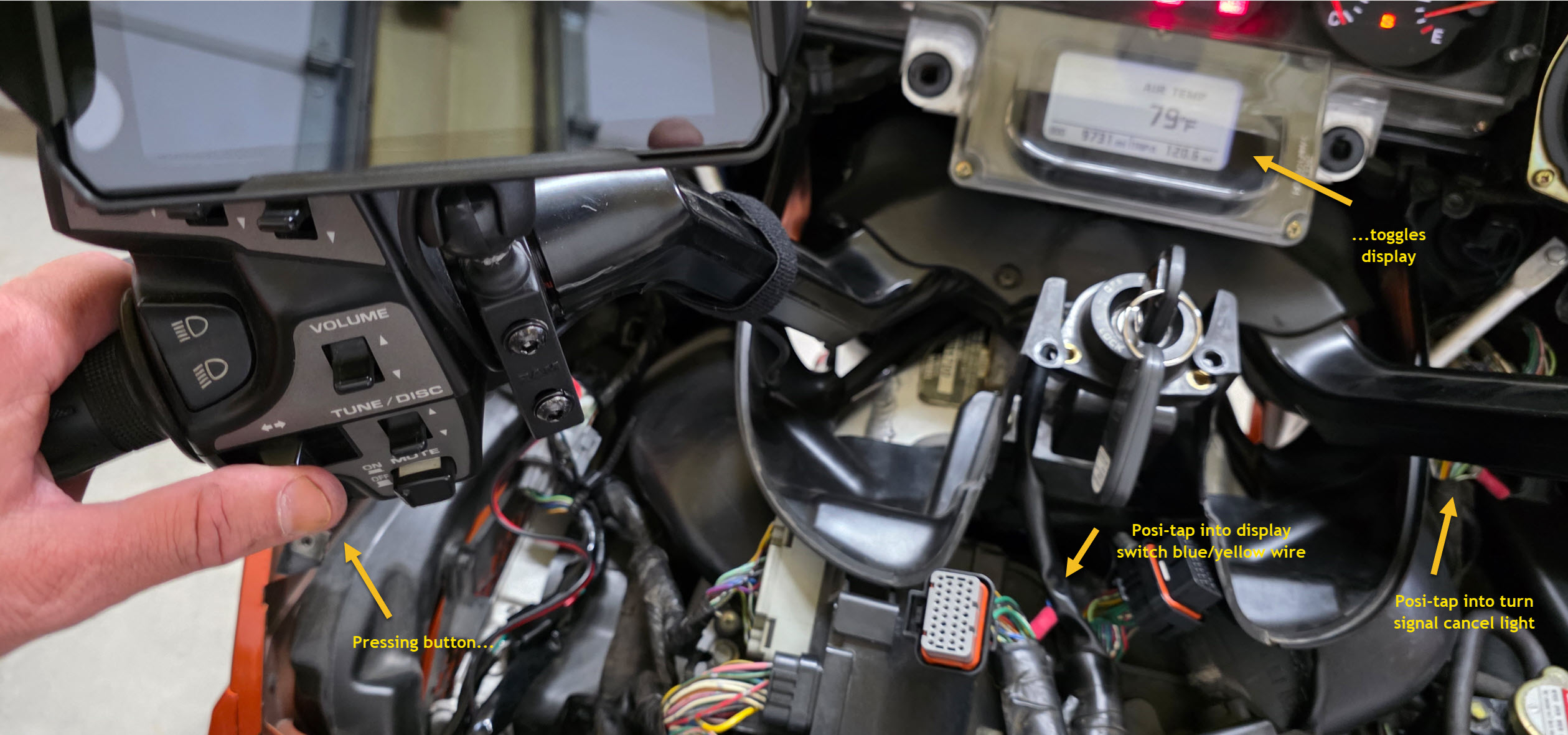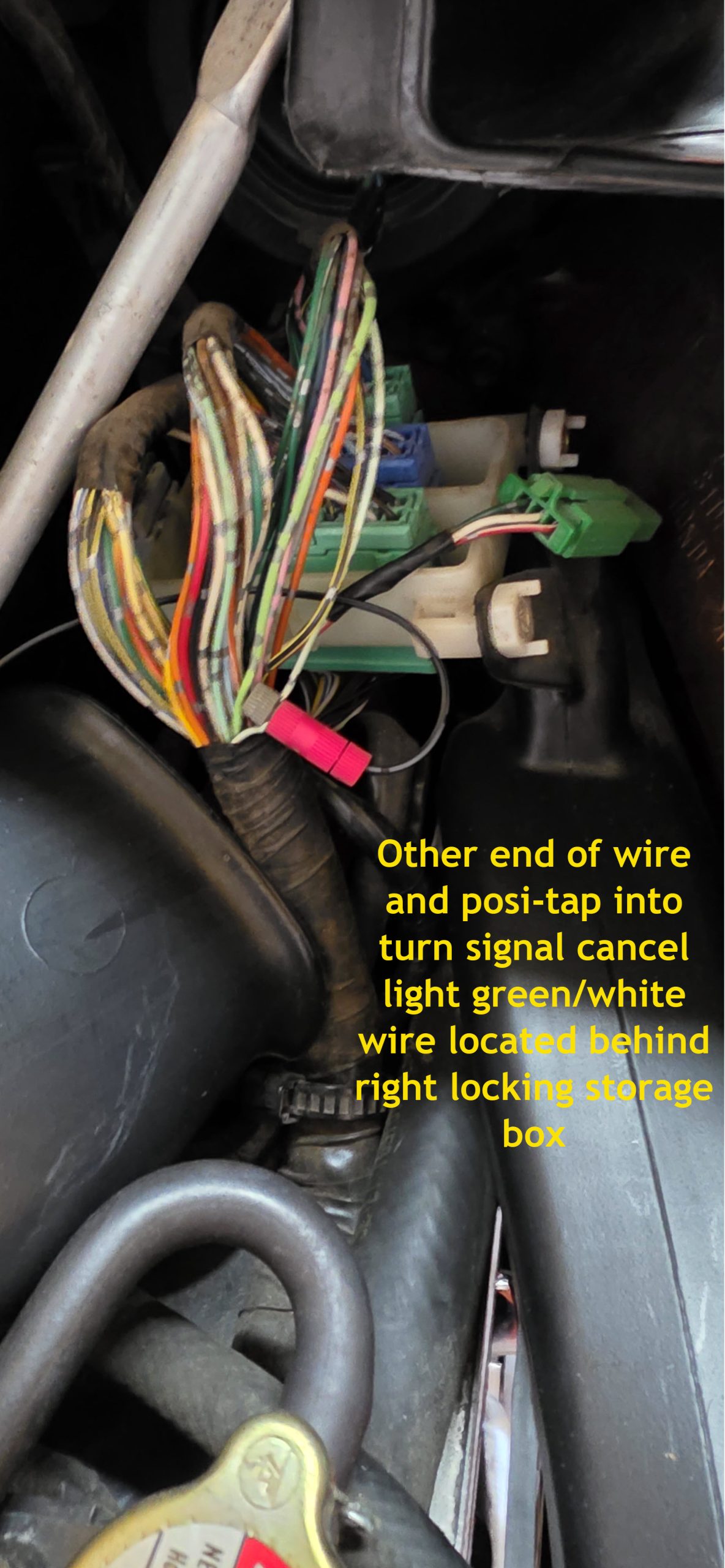 I like to be able to toggle the display to see the temperature without having to take a hand off the handle bars. It’s pretty easy to connect the turn signal cancel circuit to the display panel toggle circuit. I ran a wire from the display wire harness right below the ignition switch to the turn signal cancel wire located behind the right locking storage box. (See pics for details.) The pictures don’t show it, but I did clean up the wire routing and tie-wrapped it in place. Since I already had the faring apart, the mod only took five minutes.