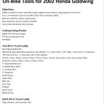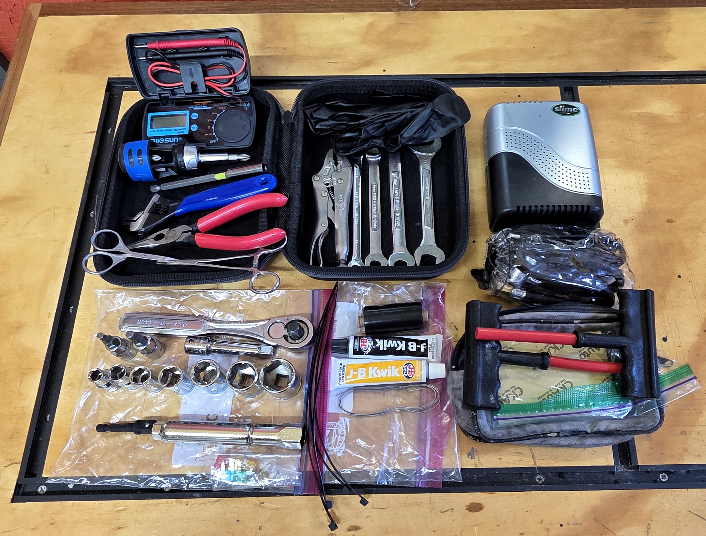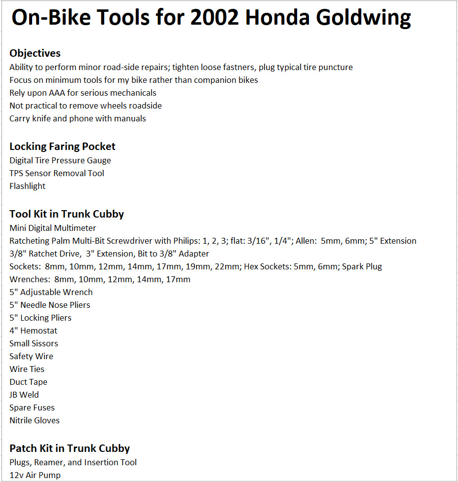 And finally, tools. I’m trying to focus on the minimum tools I need for my bike in order to perform a minor, road-side repair. Things like tighten loose fasteners, trouble shoot an electrical issue, or plug a tire puncture. I have AAA for more serious issues. The tools live in a Klein hard case which fits perfectly in the sub-trunk along with the patch kit and pump. I typically carry a pocket knife and have the manuals on my phone.