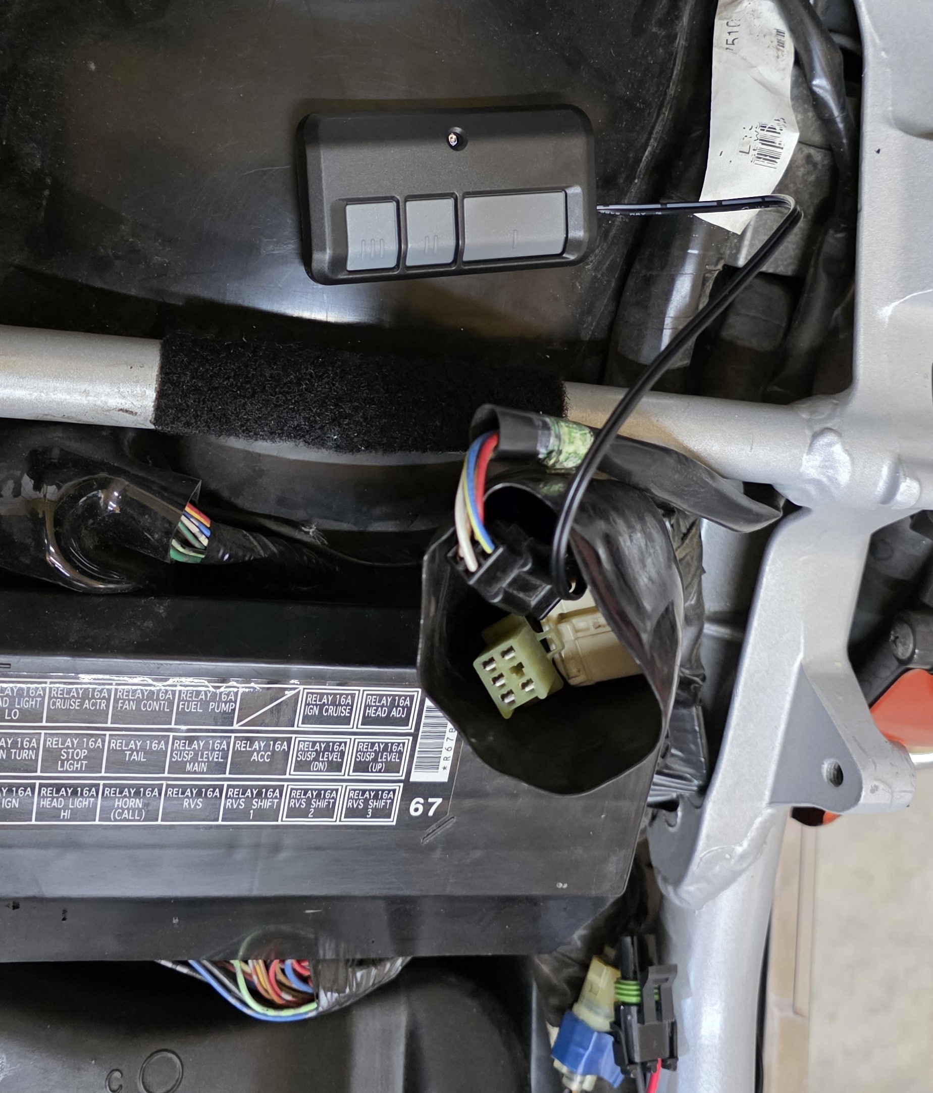Now, when you use your index finger to push down on the left handlebar PPT switch, you are effectively pushing the button on the garage remote. No more fumbling for a remote in pocket, storage box, or velcroed under the dash.