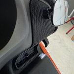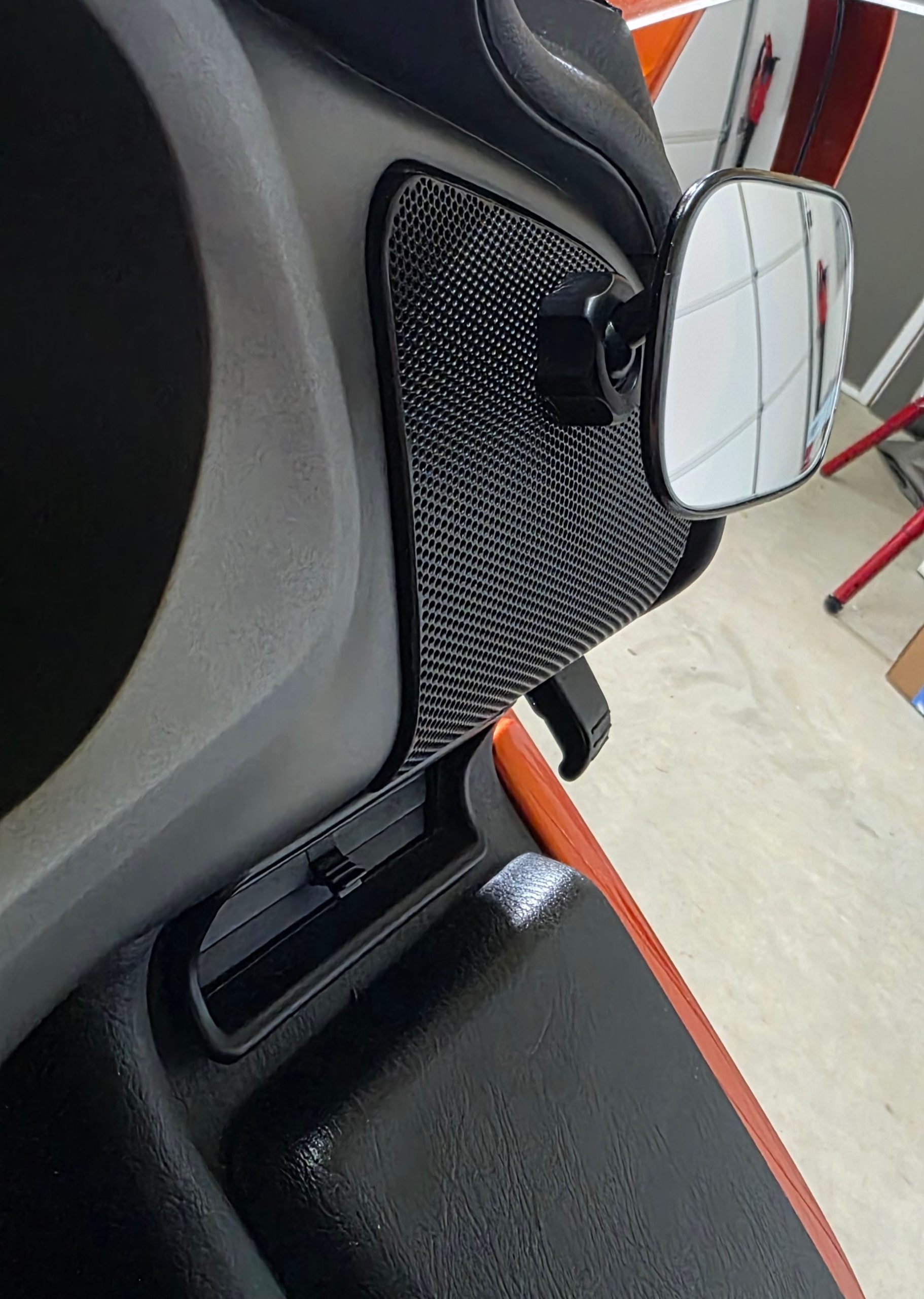 On our two-up bike, I like to have a little mirror so I can see my wife and make sure she hasn’t fallen off. This one from Amazon is designed to be a car baby mirror, but is just the right size and field of view. Since I’m not using the radio, I borrowed the speaker grill to mount the mirror.