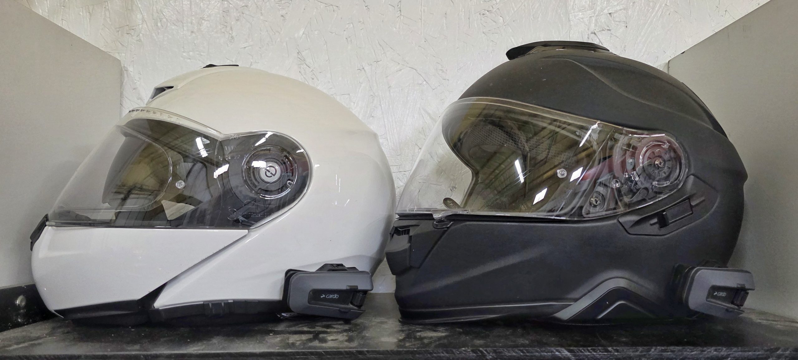 My wife and I have Cardo Packtalk Edge devices, our fourth generation of wireless comms. They worked wonderfully on our recent trip–we could talk privately, join in on the group conversation with the other couple, take phone calls, or listen to our own music or audio book. The JBL speakers sound great and are loud enough that we can wear ear plugs to block the wind noise and still hear the comms clearly. Expensive, but highly recommended.