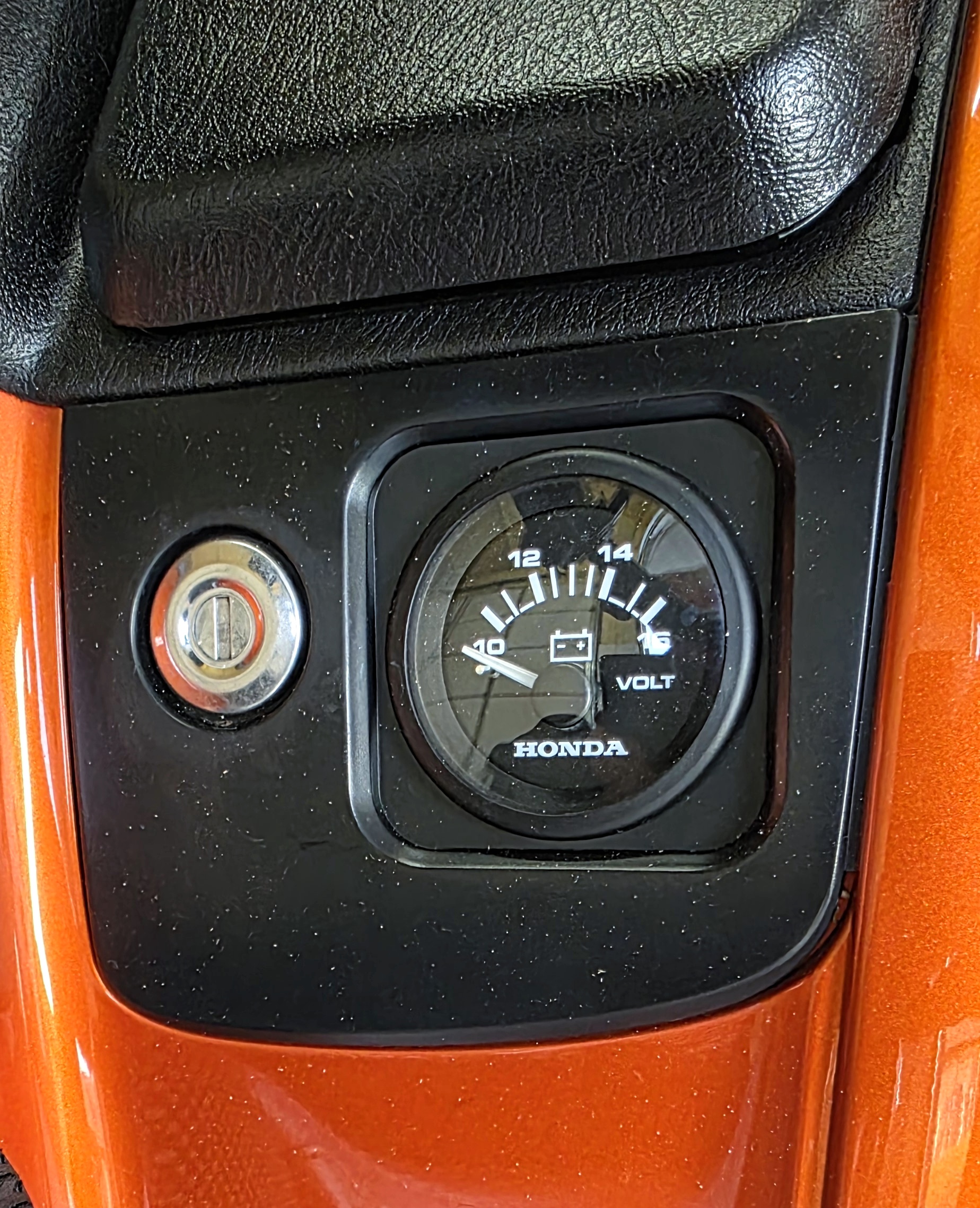 While I was there, I also picked up a volt meter with back panel. Digital is nice, but all I’m looking for is a confirmation that alternator is working and the resting and load voltages of the battery while starting. Only a few minutes to install, if you have the faring apart already. Plugs into an existing connector.