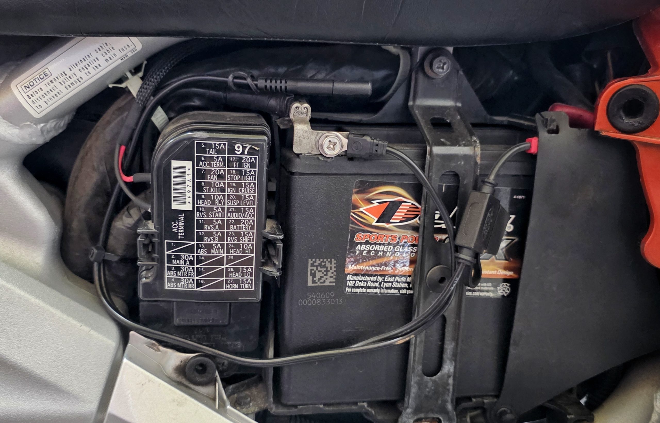 Speaking of battery voltages, I’ve never really had an issue with the battery going dead on the Goldwing, but every once in a while it’s nice to be able to put it on a tender. I added an SAE pigtail behind the side panel that covers the battery for those rare occasions.