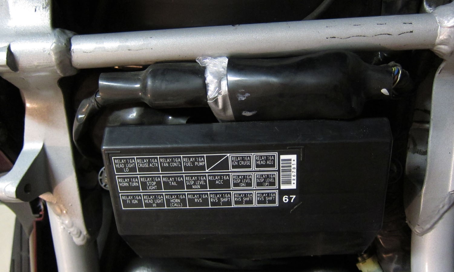 Finally, since I don’t use the radio/CB/CD, I have all of these buttons on the left handlebar that are not doing anything. I wired the CB Push to Talk (PTT) circuit into a garage door opener. The passenger PTT connector is located under the seat in a rubber boot with a bunch of other connectors. It’s a two wire connector with yellow and green wires. If you take apart the garage remote and test with a short piece of wire you can identify which leads on the back of the remote switch get connected when you press the button. Solder wires to these leads and the other end of the wires to the push to PPT connector wires. Test first as you may have to switch the polarity to get it to work correctly. Wrap the remote in a ziplock bag and stuff it into the rubber boot with the other connectors. Took about half an hour to complete.